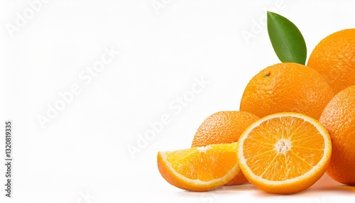 신선한 오렌지 한 개와 옆에 슬라이스된 조각이 배치된 PPT 배경이미지