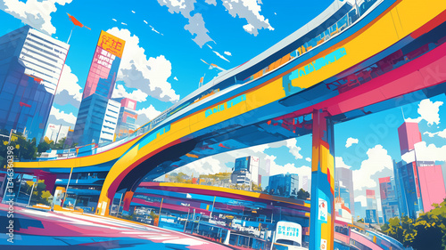 未来的な都市の風景 高層ビルとカラフルな空が織りなす幻想的な景観 シティスケープ 未来都市 デジタルペイント 商用利用OK