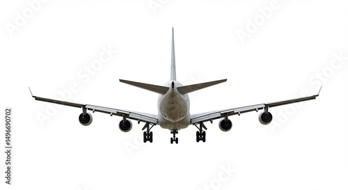 白い背景 巨大な旅客機 着陸態勢 力強く降下. AI Generated