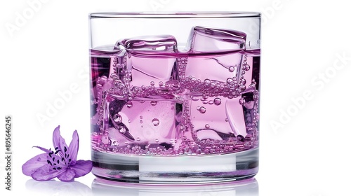 A close-up of a glass of water containing ice cubes and a flower on its side