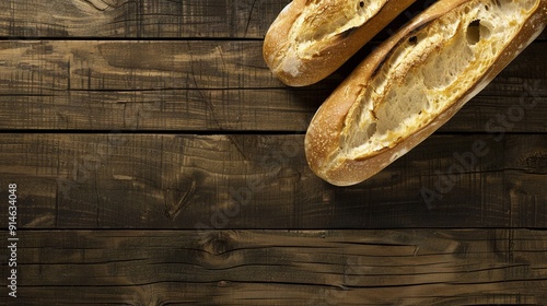 A couple of loaves of bread sits on top of a wooden table alongside a slice of bread on a wooden table