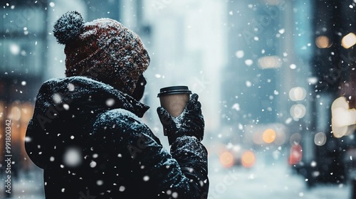 A person sips coffee in the snowy backdrop while standing on a city street