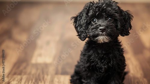 A small black dog is sitting on the wooden floor next to a wooden floor with a white spot on its face