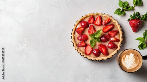 A white table holds a pie, coffee cup, and strawberries