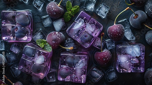 An array of ice cubes stacked atop one another, each containing a piece of fruit