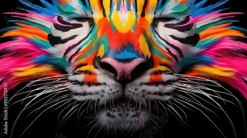 Closer view of a tiger's face, featuring multi-colored spots against dark background