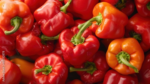 Red and orange peppers, topped with green stems and leaves, have a green stalk rising from their center