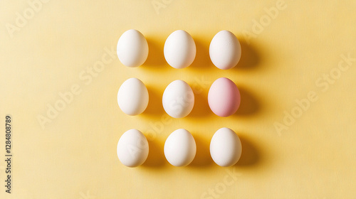 Six eggs sit together on a yellow surface, with one pink egg at their center