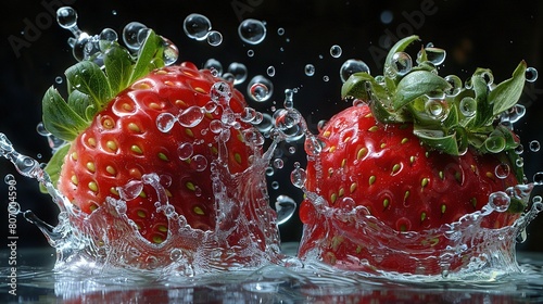 Two strawberries splash into water with droplets