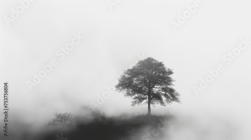 a black and white photo of a lone tree on a foggy day in a black and white photo of a lone tree on a hill.