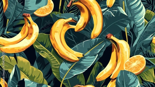 a bunch of ripe bananas sitting on top of a lush green leaf covered forest filled with yellow and green leaves.