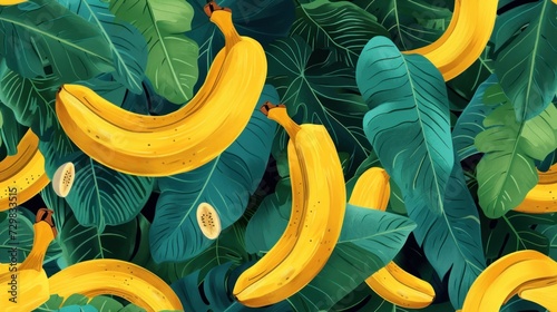a bunch of yellow bananas sitting on top of a lush green leaf covered field of banana's with green leaves on either side of the banana's, banana's, ', ', ', ', ', ', ', ', ', ', '.