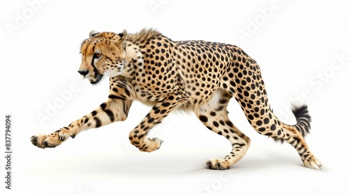 A cheetah runs on a white background, poised to pounce and bite a piece out of another cheetah