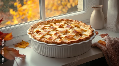 A classic apple pie in an elegant white porcelain dish, placed on the windowsill of a cozy kitchen with autumn leaves outside.