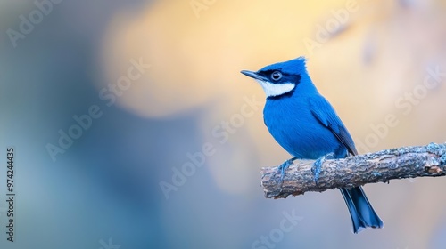 A clear-sky backdrop conceals a blue bird perched on an distinguishable tree branch