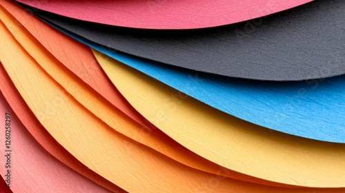 a close up of a pile of colorful paper, with a variety of colors ranging from bright blues and greens to warm oranges and yellows The paper is arranged in a neat s
