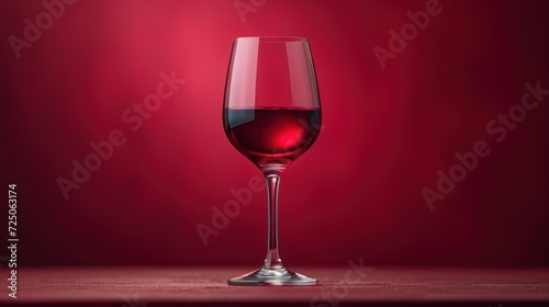 a close up of a wine glass with a red liquid inside of it on a table with a red background.