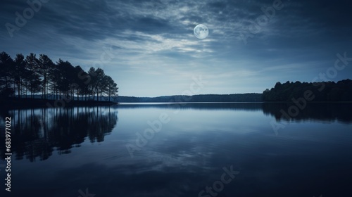 a large body of water with trees on both sides of it and a full moon in the sky above it.