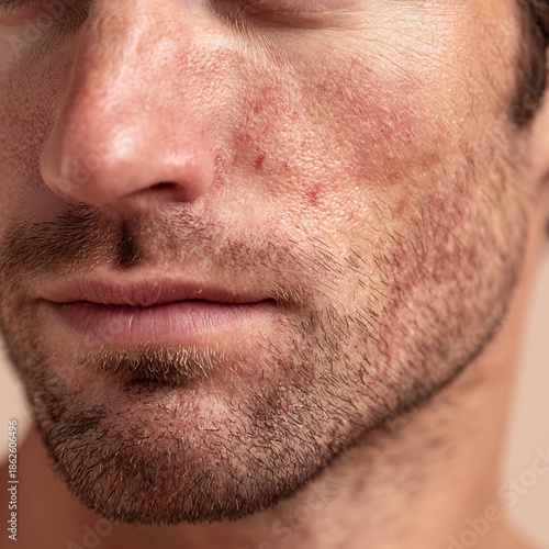 A man's skin after shaving shows redness and irritation; a natural skin appearance, ideal for advertising men's aftershave products, cosmeceuticals, and grooming brands focusing on sensitive skin.