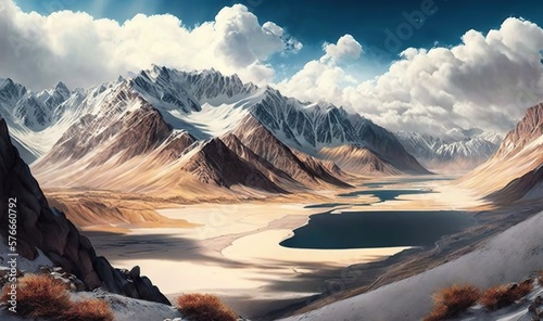 a painting of a mountain range with a lake in the foreground. generative ai