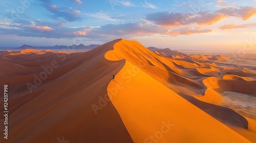 A person atop a sand dune amidst desert landscape during sunset