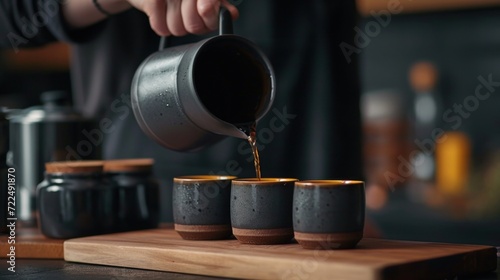 a person pours a cup of coffee from a teapot into four cups on top of a cutting board.