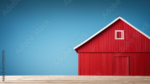 a red barn sitting on top of a wooden floor next to a blue sky with a white square in the center of the roof and a square window at the top of the building.
