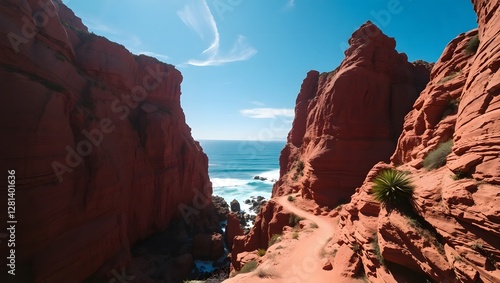 a rugged coastline with towering red rock cliffs and a winding dirt path along the edge. The ocean waves crash against the jagged rocks below