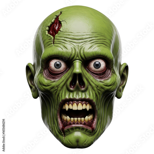 a terrifying green zombie head with a gaping mouth, showing sharp teeth and a wound on its forehead, isolated on transparent background