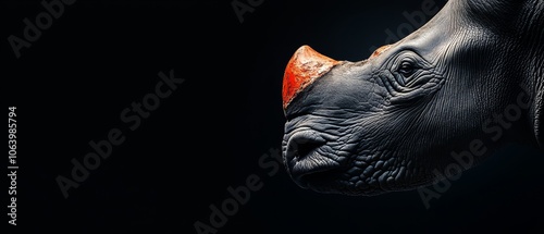 A tight shot of a rhino's face in the dark..Or, for a more descriptive version:..An intricate view of a rhino'