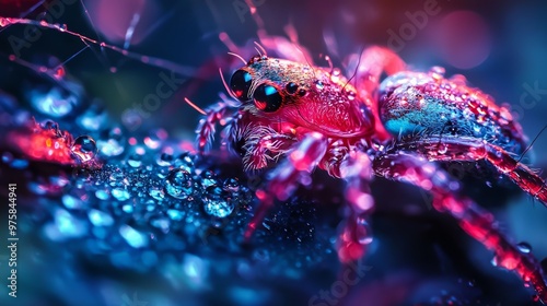 A tight shot of a spider perched on a leaf, with droplets of water clinging to its back legs