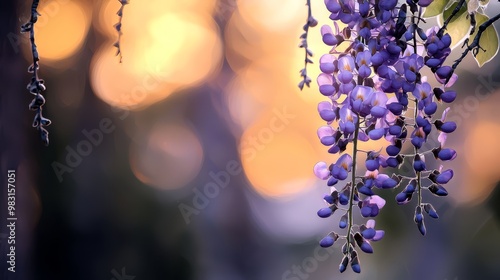 A tight shot of several purple flowers dangling from a tree against a backdrop of sunlight filtering through the foliage