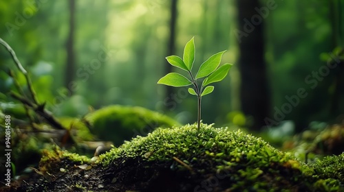 A tiny green plant emerges from the forest floor, surrounded by lush green moss