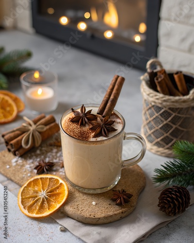 "A warm, cozy setting with a close-up of a Christmas cocktail in a mug, garnished with cinnamon sticks, star anise, and a slice of orange. The background features a softly lit fireplace and holiday .