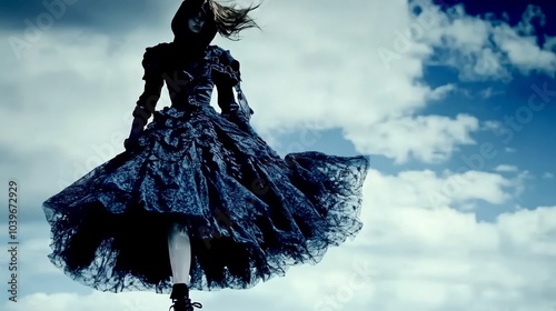 A woman in a blue dress soars through the air, her hair billows in the wind In the backdrop, clouds drift by