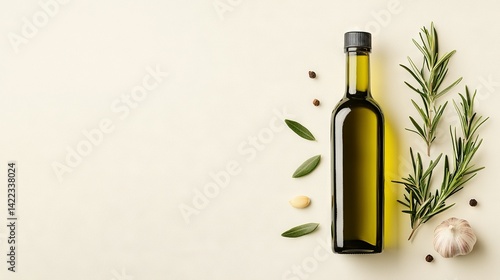 Aerial view of olive oil bottle with rosemary sprig on white background