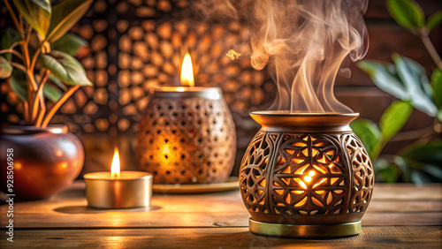 Aroma Lamp with Smoke and Burning Candles in a Relaxation Room for Meditation and Spa