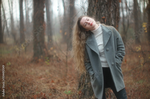 beautiful young blonde with long flowing hair on a blurry background of autumn coniferous forest