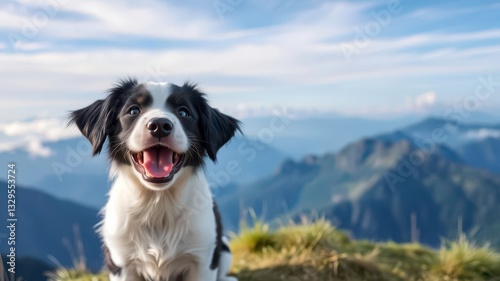 Black and white puppy with a big smile, sitting on a grassy hilltop with mountains and clouds in the background