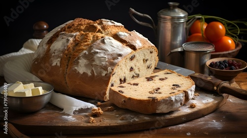 Bread loaf with butter, cheese, and tomatoes.