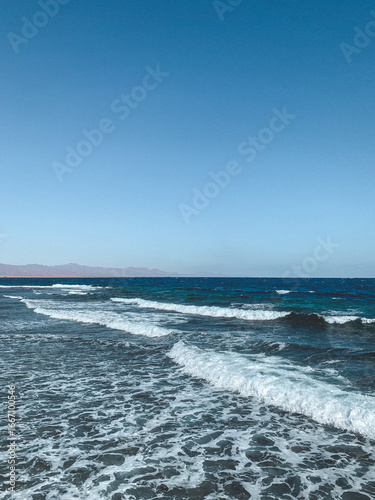 Bright blue ocean with strong waves rolling under a clear sky.