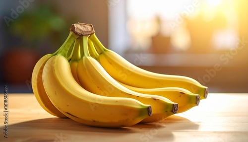 Bunch of ripe yellow bananas on a wooden table, healthy option for cooking or eating, ideal for a healthy lifestyle