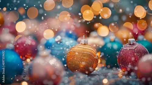 Christmas mood. Bright colorful tones. In the foreground on top there are multi-colored Christmas balls, in the background there is a bokeh garland.