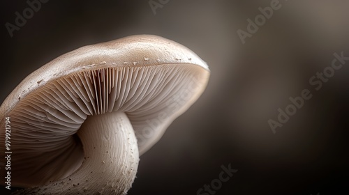 Close-up of a mushroom against black-and-white backdrop, featuring water droplets atop