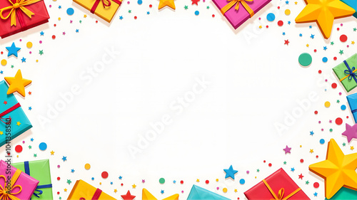 Colorful Gifts and Stars Frame with Confetti on White Background