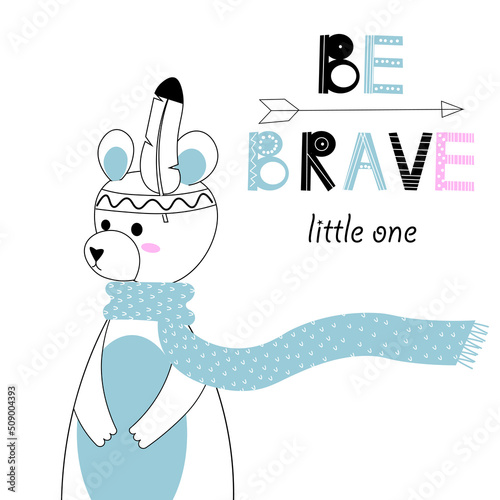 Cute nursery poster including bear, fox, tribal elements, mountains, phrases: be brave. Adventure theme. Vector illustrations for invitations, greeting cards, posters