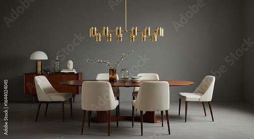 Elegant dining room space with walnut oval table, upholstered cream chairs, brass chandelier, Mid Century Modern styling.