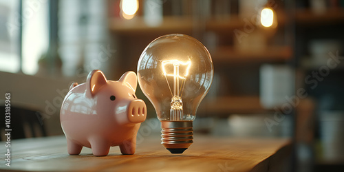 Energy Saving Concept with Piggy Bank and Glowing Light Bulb