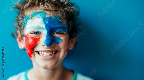 European football championship UEFA Euro 2024. a girl fan of the French soccer team with her face painted with the colors of the French flag