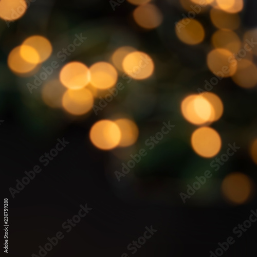 Golden Christmas bokeh lights on black Background. Abstract Yellow glowing efocused lights, copyspace